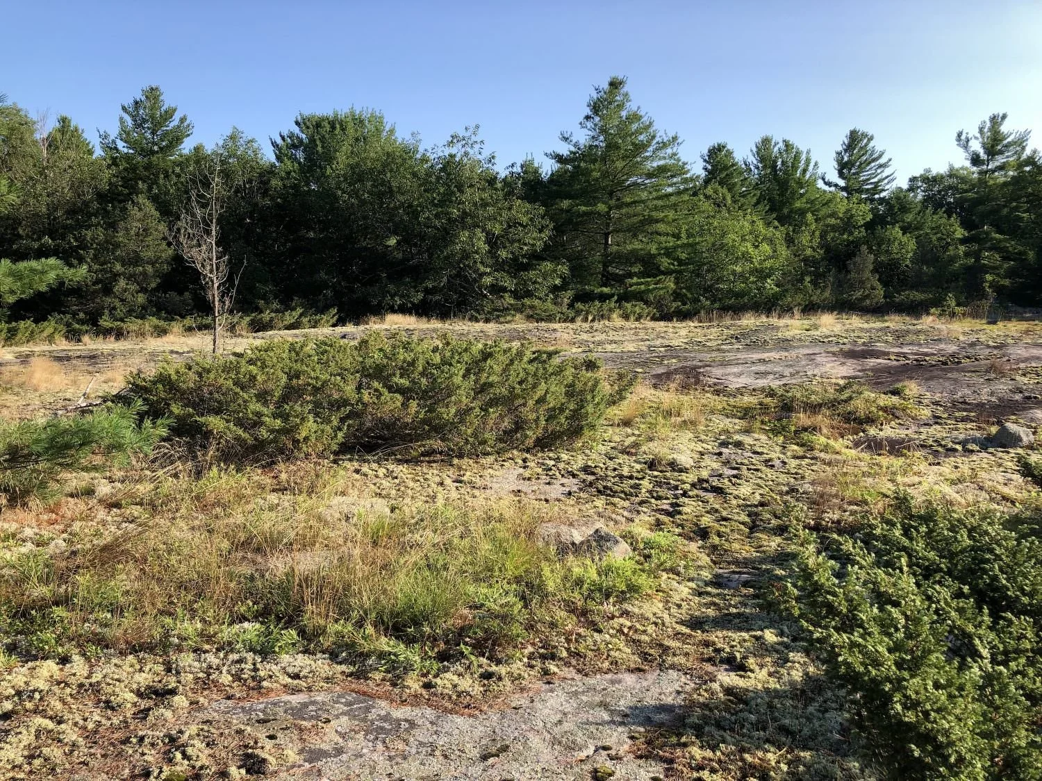 Donated by Jill Hodgins Ukrainec and Terry Ukrainec, the 30.5 acre Roberts Island Reserve is a generous-sized and diverse property that features a large Provincially Significant Wetland along its south shore. Roberts Island Reserve’s forest communities shows its more southern affinities; a Dry-Fresh Oak Deciduous Forest makes up almost half of its land area, and the bulk of the balance is Oak-Red Maple-Pine Treed Rock Barren. White Pine is not the dominant tree species here. Like its huge Georgian Bay Islands National Park neighbour across the bay, Beausoleil Island, Roberts is on the transition or “contact” zone between northern Shield and southern Moraine, and as the soil deepens moving inland from the coast, the species mix and dominance changes. There are abundant White Oak for instance, and big Red cedars (actually an upright juniper).
