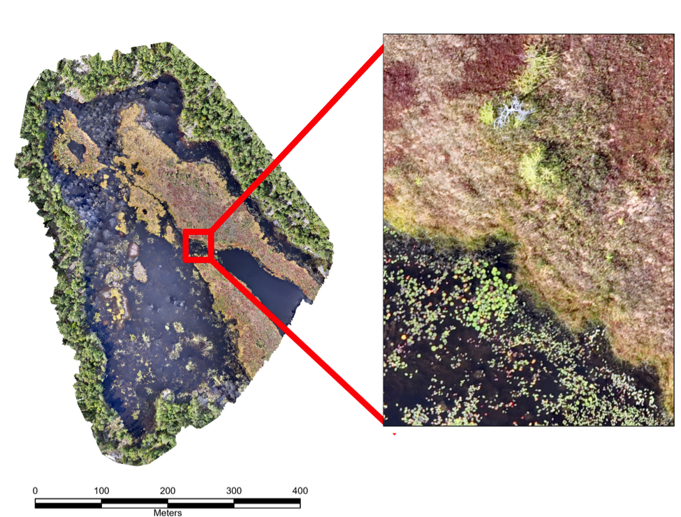 This map of the Red Marsh was created using over 1200 images from the drone. It includes sections of fen, marsh and open water. The inset shows an example of how we are able to classify the different wetland types and can even identify individual water lilies.