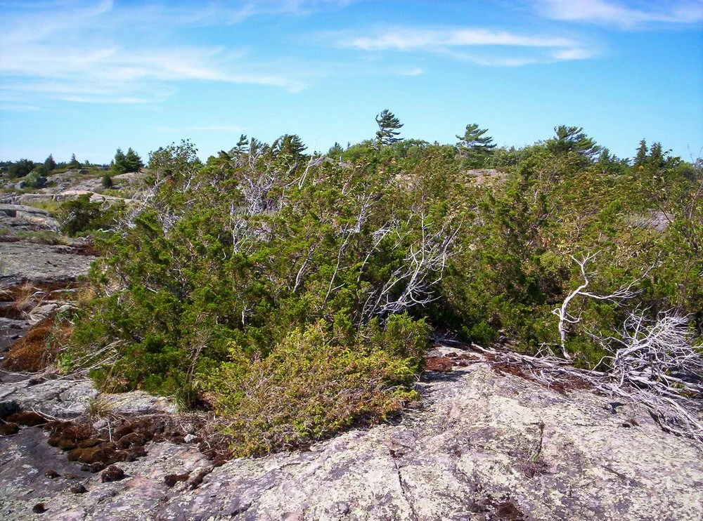 The island is primarily open bedrock with localized patches of vegetation typical of both rock barren communities and wetland communities. Small depressions in the bedrock often create moist conditions that support a variety of wetland species including Round-leaved Sundew and Small Purple-fringed Orchid. During low water conditions, an emergent meadow marsh community connects this island to the adjacent, inhabited island known as Trusty Island.